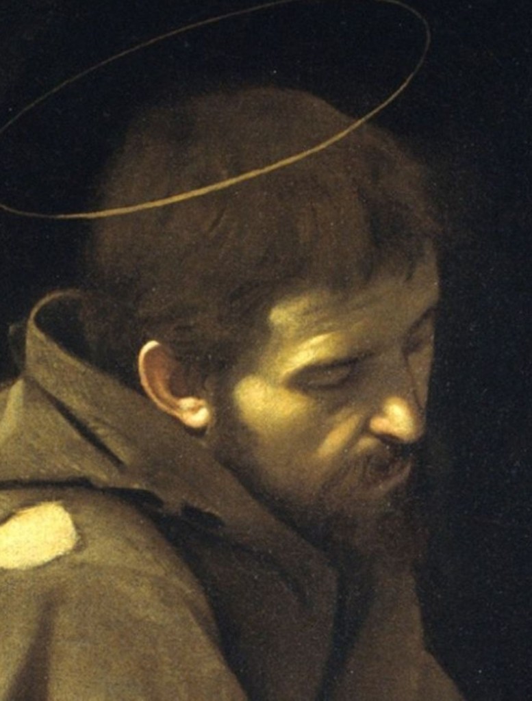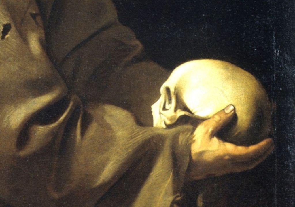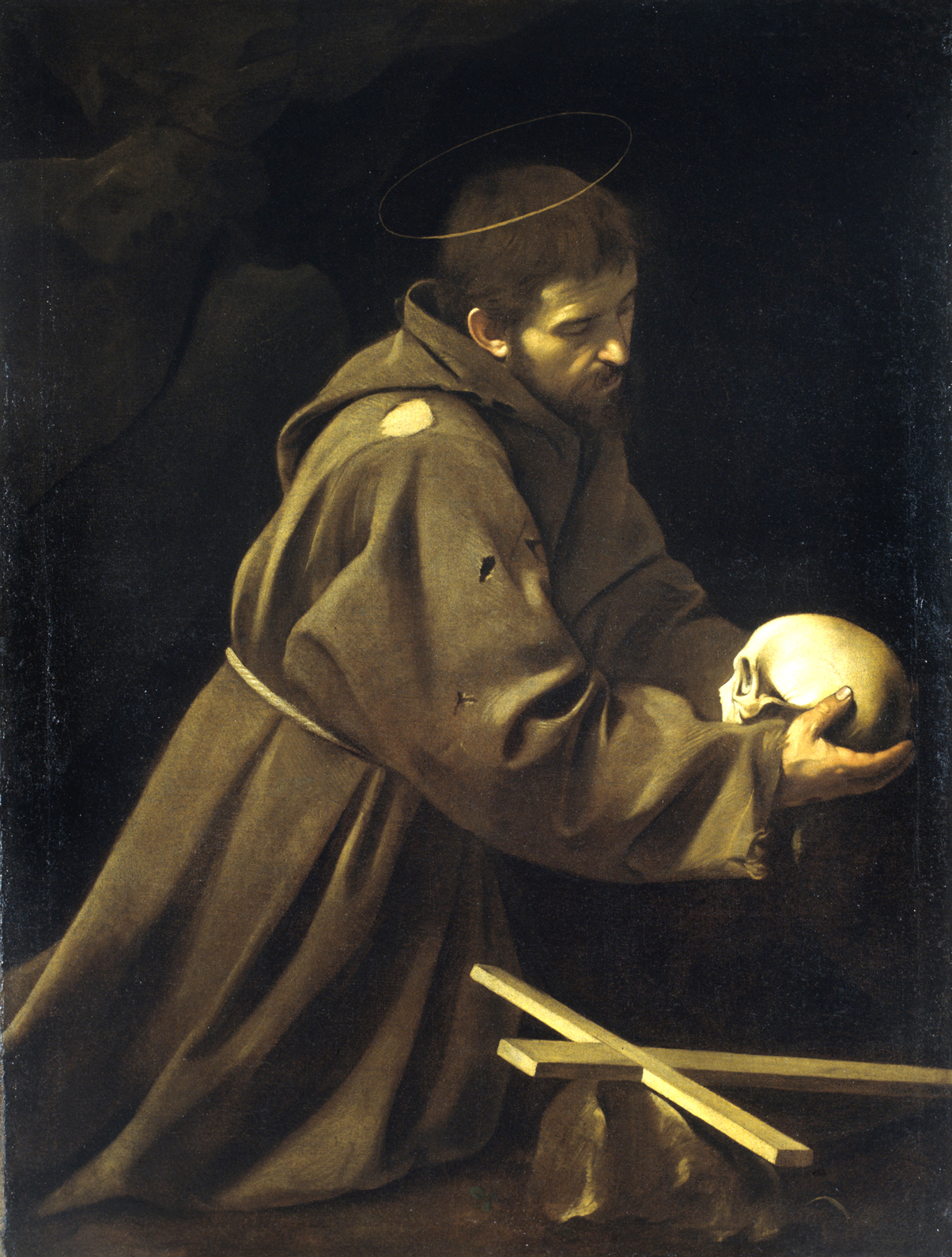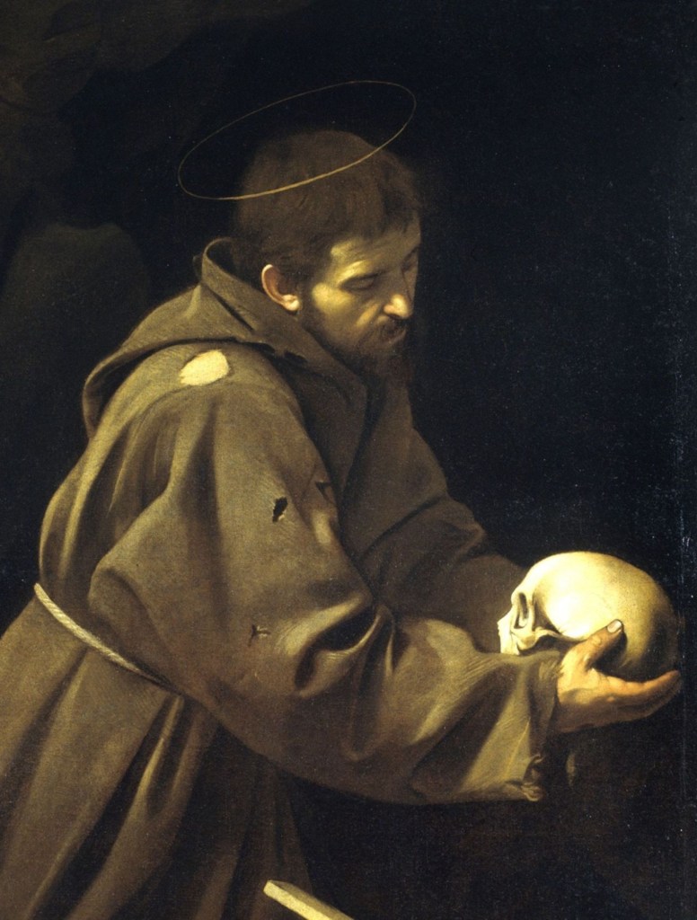 Michelangelo Merisi, bekannt als Caravaggio malte den Ordensstifter in einer Pose, die an Shakespeares Hamlet erinnert. Der Erfinder der Hell-Dunkel-Malerei setzte auch bei diesem Werk das Licht meisterhaft ein. Die Szene wird von vorne links, wie mit einem Spot beleuchtet, streift das Gesicht des Franziskus und hebt besonders den Totenschädel hervor. Franziskus sinniert über den Tod. Seine zerrissene Kutte symbolisiert seine Demut. Er muss in seinen letzten Lebensjahren sein, nachdem er bereits die Wundmale Christi erhalten hat, die man bei genauem Hinsehen an seiner Hand erkennt.