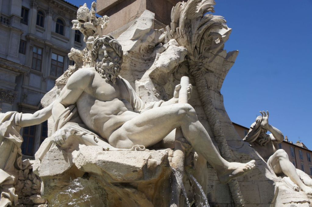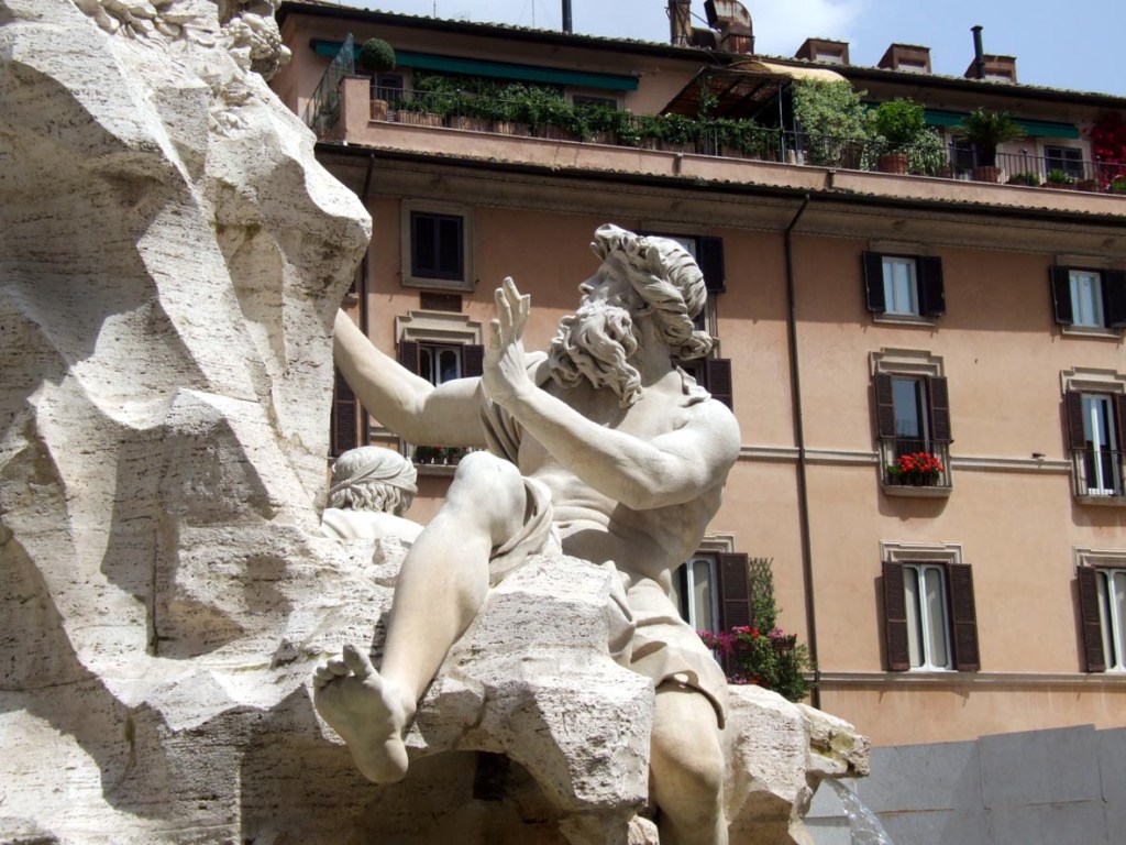 Der Rio della Plata erhebt seine Arme, als befürchte er die Fassade der Kirche Sant’Agnese, ein Werk des Bernini-Konkurrenten Borromini, würde gleich einstürzen. Ein bissiger Kommentar Berninis? Die nette Anekdote krankt daran, dass bei der Fertigstellung des Brunnens noch nicht absehbar war, dass Borromini den Auftrag bekommen würde.
