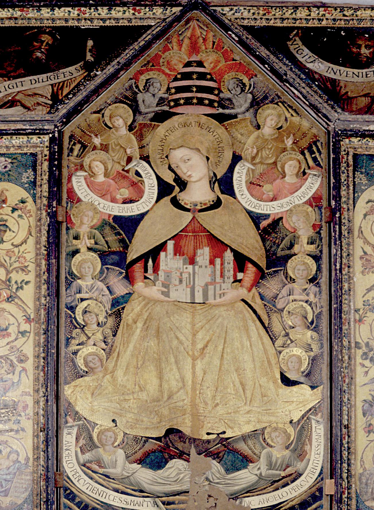 Das wichtigste Kunstwerk findet man gleich in der ersten Kapelle links, der Capella de Marchis. Zwischen 1452 und 1458 malte Benozzo Gozzoli für den Altar eine wunderschöne Madonna in goldenem Mantel, bekrönt mit einer päpstlichen Tiara. Sie ist von einer Schar Engeln umgeben, die teilweise sogar wie Ritter bewaffnet sind und so die Stadt Sermoneta beschützen. Einige Engel breiten Spruchbänder aus. Oben links zeigt ein Engel ein Motto, das aktueller kaum sein könnte: „Schadet der Erde und dem Meer nicht.“ Die Madonna birgt die Stadt Sermoneta zwischen ihren Armen auf ihrem Schoß. Eine Stadt reich an Türmen. Ganz rechts der Turm, unter dem das Bild hängt, noch mit einer Pyramide und Turmspitzen verziert, die 100 Jahre später durch Blitzschlag zerstört wurden. Auch viele der anderen Türme haben den Lauf der Zeit nicht überstanden.