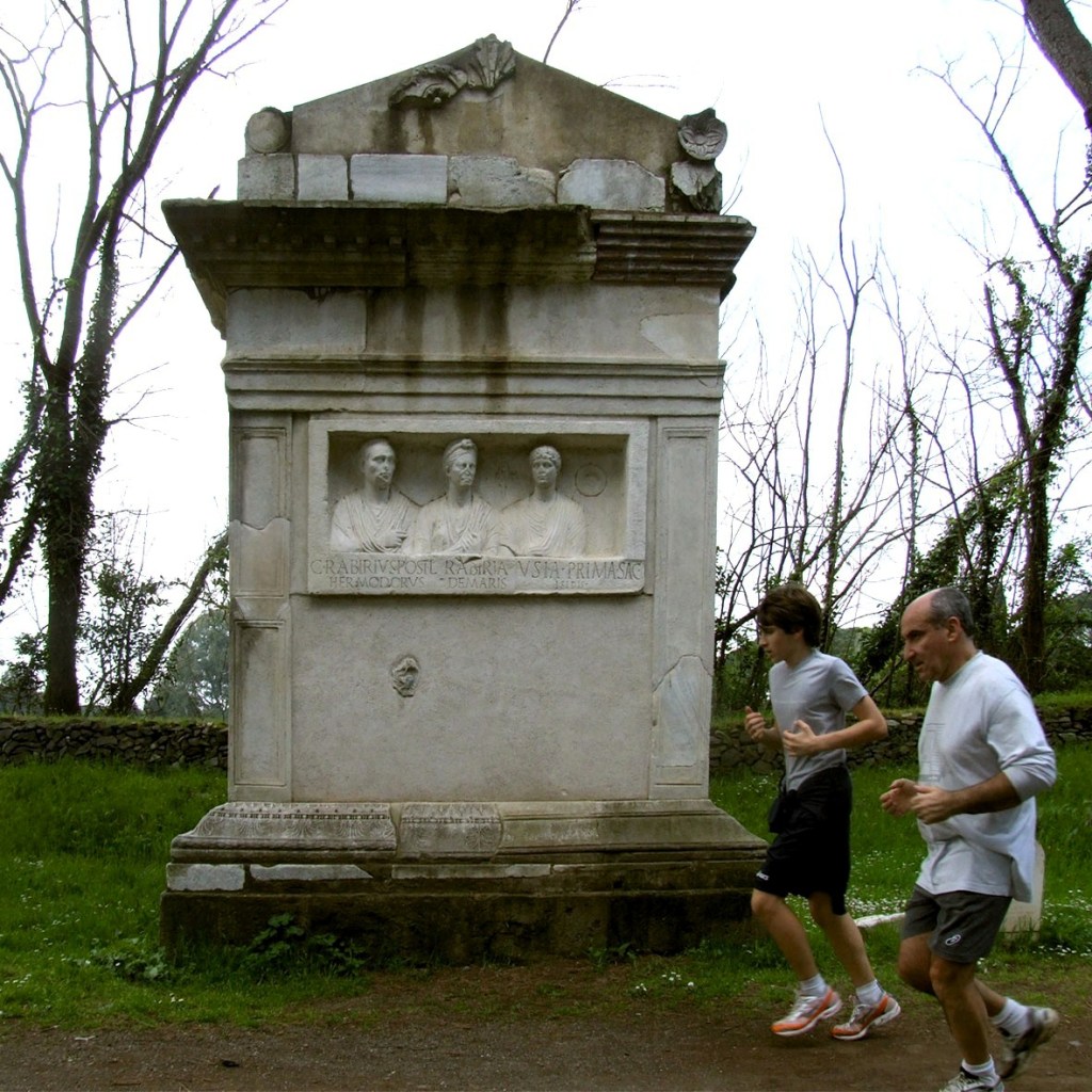 Wenn wir eine halbe Stunde von der Basilika San Sebastiano stadtauswärts wandern, treffen wir auf die Steintafel mit drei Porträtbüsten der Familie Rabirius. Sie wurde von Luigi Canina, der seit 1848 als Archäologe für die Via Appia zuständig war in eine von ihm errichtete Mauer eingelassen. Wie die tatsächliche Grabstätte aussah, wissen wir nicht. Die originale Grabplatte befinden sich seit 1972 im Museo Nazionale im Standort Palazzo Massimo neben dem Bahnhof Termini. Doch ich finde es schöner die gute Kopie vor Ort in der Natur zu besuchen.
