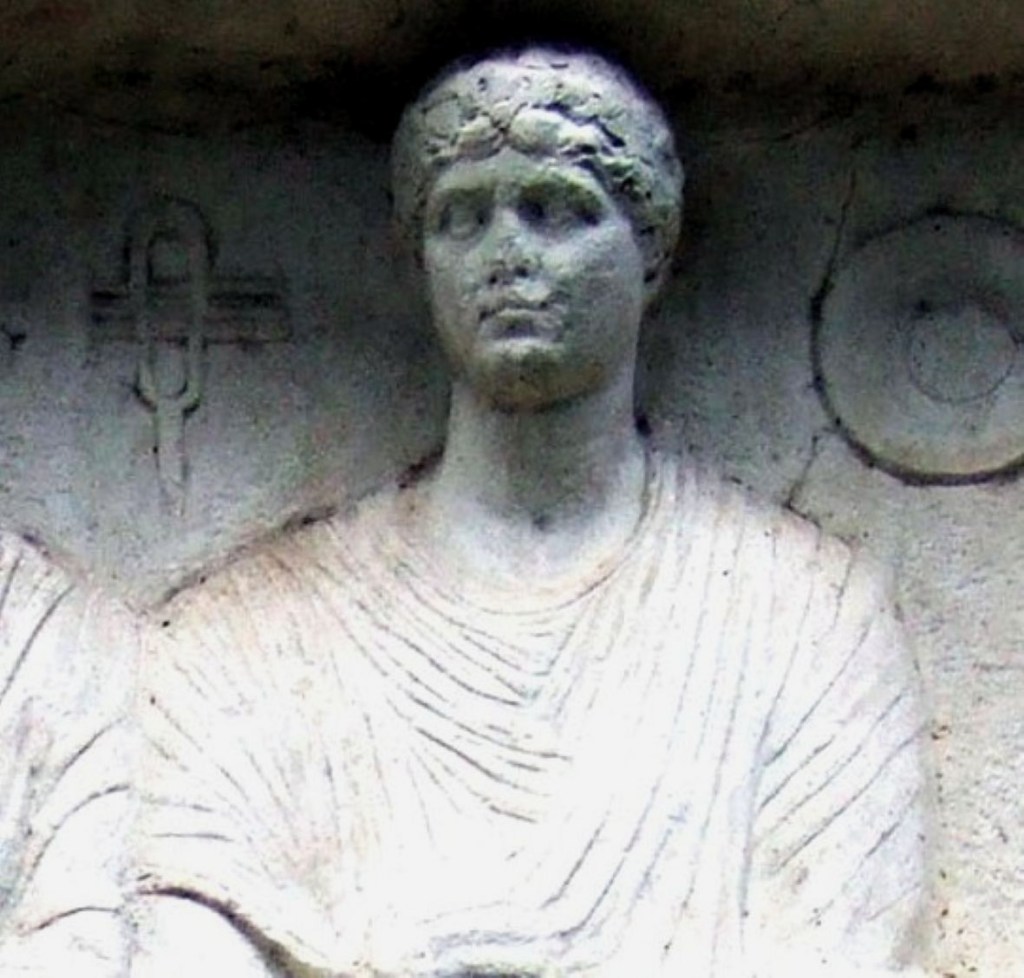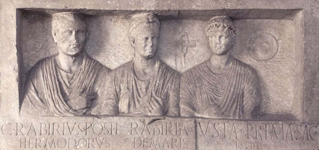 Die Inschrift der Namen der drei Personen sind leicht zu erkennen. Auf der linken Seite sehen wir C(aius) Rabirius Post L Hermodorus. Achtet auf das „L“ am Ende des Namens. Es steht für libertus, also freigelassen. Rabirius Hermodorus war also ein freigelassener Sklave. Er lebte und arbeitete im Haus der Gaius Rabirius Postumus. Es war üblich, dass er bei seiner Freilassung den Namen seines Herrn annahm. Das Kürzel Post. L. heißt also Freigelassener des Postumus. Dieser ist bekannt, da in einem Korruptionsprozess (das gab es damals schon) Cicero seine Verteidigung übernahm. Seine Rede Pro Rabirio Postumo ist bis heute erhalten. Rabirius Postumus stand im Bürgerkrieg auf der Seite Cäsars und wurde von ihm 47 v.Chr. zum Prokonsul in der Provinz Asia, also der Westtürkei, eingesetzt.
