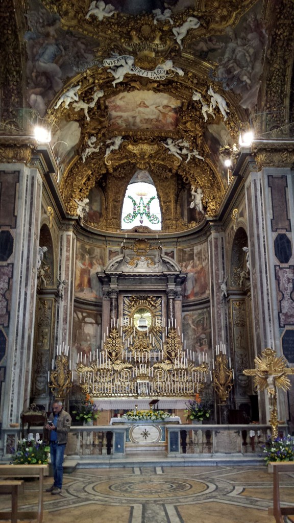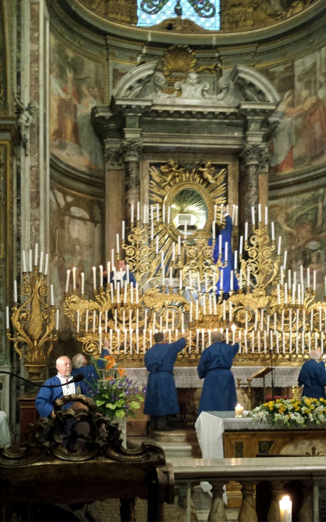 Doch ich kann noch eine atmosphärisch sehr schöne Alternative empfehlen. Im Stadtteil Trastevere wird am Gründonnerstagabend die sogenannte „macchina di quarant’ore“ entzündet. Der „Apparat der 40 Stunden, ein vergoldeter Holzaufbau, der fast den gesamten Chor einnimmt, trägt 213 Kerzen, die in den folgenden 40 Stunden herunterbrennen sollen. Sie geben die Zeit vor für ein 40-Stunden-Gebet, das an die Zeit erinnern soll, die Jesus bis zu seiner Auferstehung im Grab lag. Vierzigstundengebete vor Ostern wurden um 1530 in Mailand von den Kapuzinern eingeführt und erfreuten sich zur Zeit der Gegenreformation nicht nur in Italien größter Beliebtheit. Einige der bekanntesten Barockarchitekten schufen aufwendige 40-Stunden-Apparate, die meist nur einmal verwendet wurden. Berühmt war der Apparat den Bernini für die Cappella Paolina 1629 schuf. Die macchine di quarant’ore wurden nicht nur zu Ostern sondern auch zu Begräbnisfeiern oder, als Gegenveranstaltung zum gottlosen Treiben, während des Karnevals eingesetzt.
