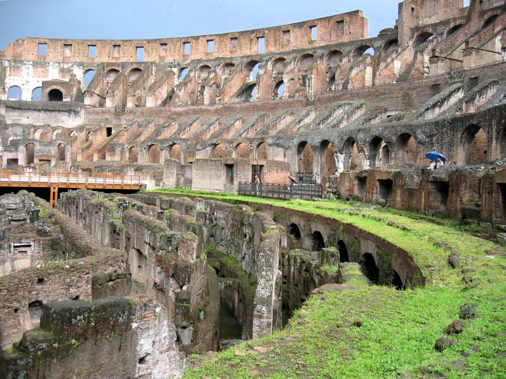 Das Amphitheatrum Flavium wie es nach der Kaiserdynastie hieß, die es erbaute, hatte einige Vorbilder. Das älteste, dessen Ruinen wir heute noch sehen können, ist die Arena in Pompeji, die um 80 v.Chr. gebaut wurde. Berühmt war auch das Amphitheater in Capua. Unter Kaiser Augustus wurde 29 v.Chr. in Rom das Amphitheater des Statilius Taurus, benannt nach dem Konsul, der Bauherr war, eingeweiht. Es befand sich gegenüber der heutigen Engelsburg und wurde beim Brand unter Nero zerstört. Nach Neros Sturz gab Vespasian den Befehl den großen See im Park von Neros Goldenem Haus, der Domus Aurea, trockenzulegen und dort die Arena, die wir heute als Kolosseum kennen zu bauen. Obwohl die Bauzeit selbst für heutige Verhältnisse mit weniger als 8 Jahren ausgesprochen kurz war, erlebte Vespasian die Fertigstellung nicht. Sein Sohn Titus konnte 80 n.Chr. den Bau mit 100-tägigen Spielen einweihen. Wahrscheinlich wurde dabei die Arena auch für Schiffskämpfe geflutet. Die ausgeklügelten Kellerräume mit Aufzügen, mit denen wilde Tiere, Gladiatoren oder auch Bühnendekoration nach oben befördert wurde, wurden erst danach eingebaut.