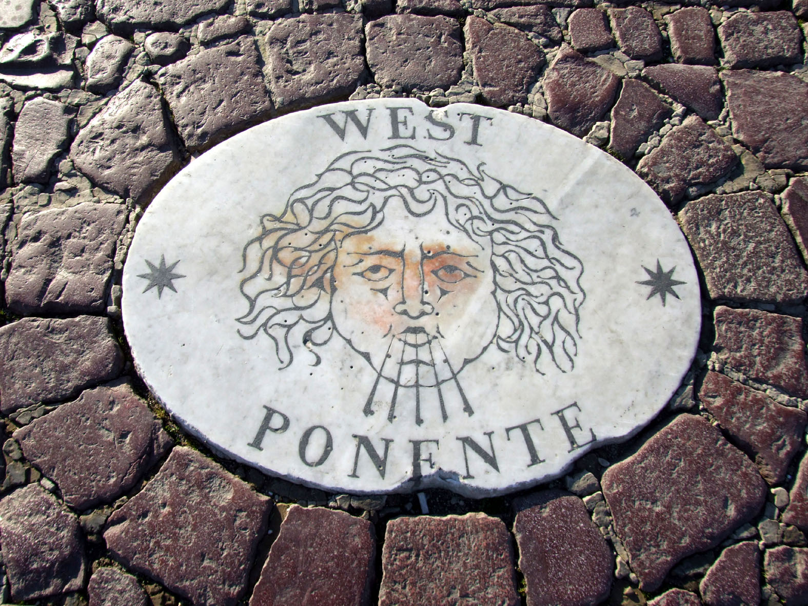 Doch wer das Buch (oder den Film) Illuminati kennt, weiß, dass es auch in Rom eine Geschichte der Winde gibt. Vielmehr, er ahnt es vielleicht höchstens. Da Dan Brown ziemlich schlecht bis gar nicht für seinen Thriller recherchiert hat, gibt die Marmortafel mit der Aufschrift „West Ponente“ ganz zusammenhangslos den Schauplatz für den Mord an einem Kardinal her. Da hat Dan Brown eine Geschichte wie im Englischen Patienten verschenkt. Der Leser erfährt nichts über die Bedeutung des Ponente und dass die Marmortafel nur eine von 16 Steinen einer großen Windrose ist, die um den majestätischen Obelisken auf dem Petersplatz liegt. Falls ihr mal dort seid, schaut sie euch an und ihr wisst, aus welcher Richtung der Wind weht.