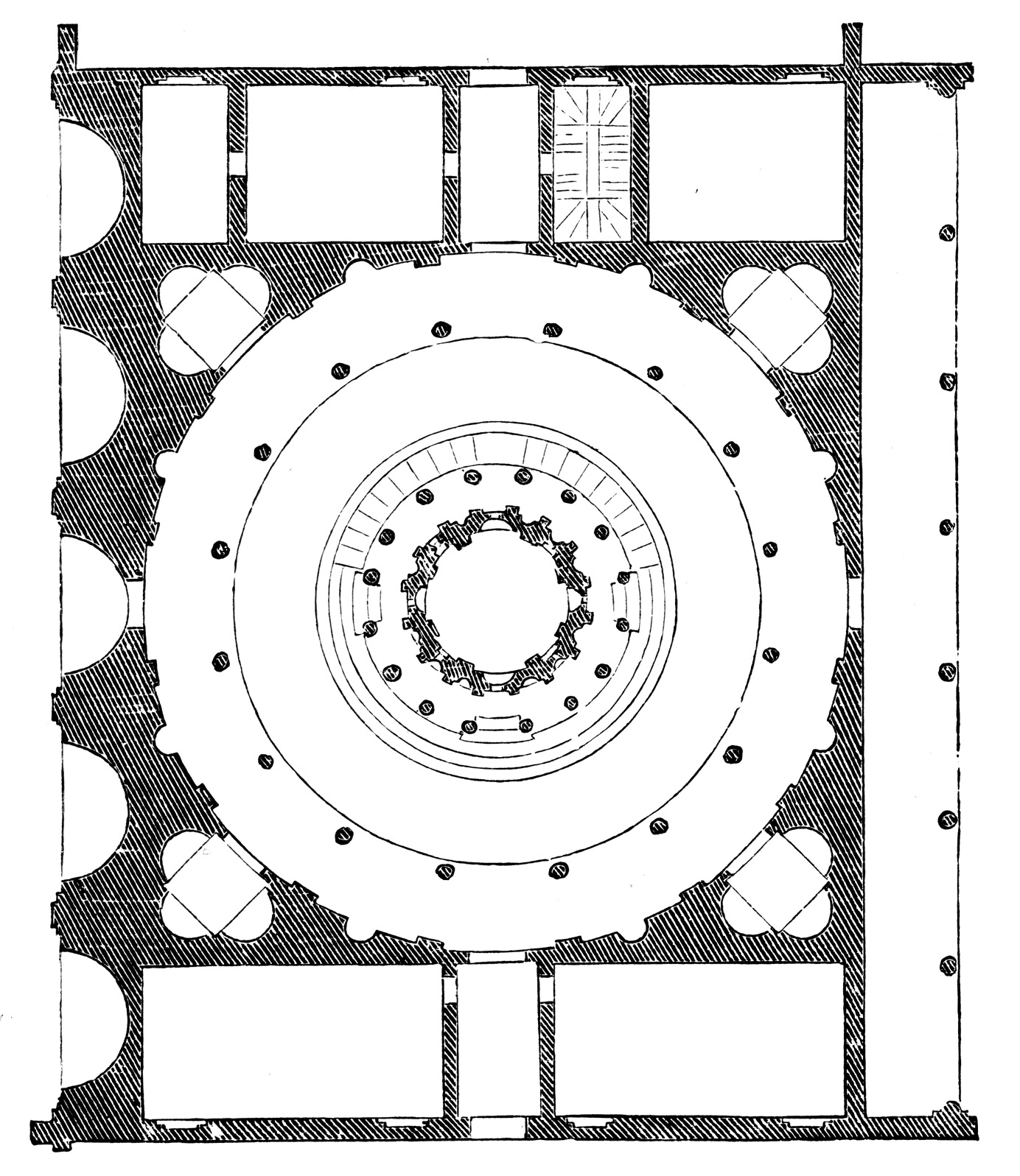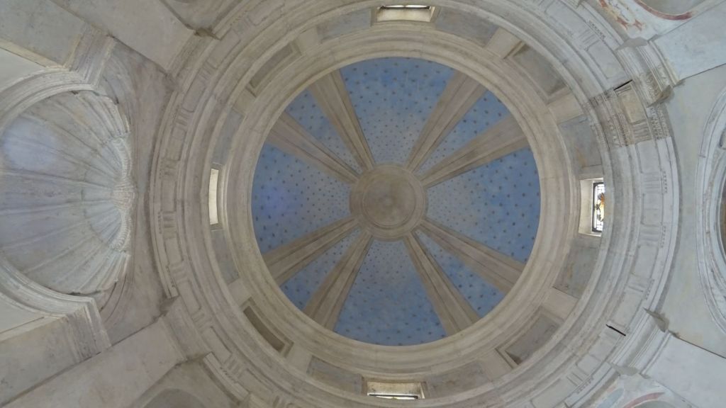 Der Tempietto glich einem Paukenschlag, einer Revolution und beendete das Mittelalter in der römischen Kunst mit einem Schlag. Bramante hatte Vitruv gut studiert. Der Architekturtheoretiker aus der Zeit Julius Cäsars. Von ihm und der Anschauung der Ruinen vor Ort kam er auf die ideale Form für den Gedächtnisbau. Einen Tholos, einen kleinen Rundtempel. Und da für Vitruv 16 die ideale Zahl war umgab Bramante den Tempel mit 16 antiken Säulen, streng nach der toskanischen Ordnung. Der Fries darüber zeigt zwischen antikisierenden Metopen christliche liturgische Geräte.