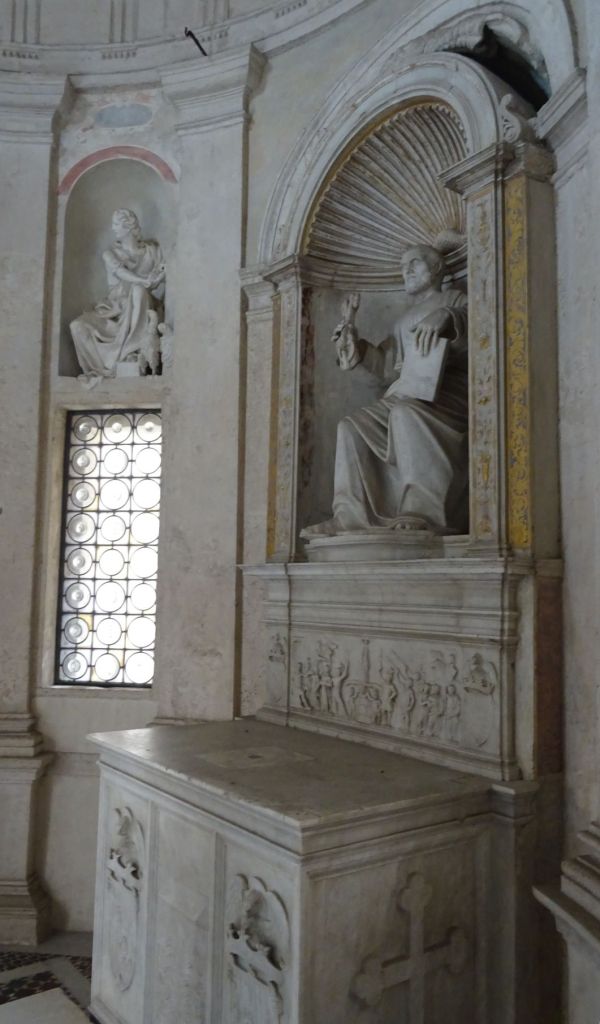 Donato Bramante, der große Renaissancebaumeister, kam kurz vor dem Heiligen Jahr 1500 von Mailand nach Rom. Allerdings musste erst einmal kleine Brötchen backen. Er bekam kleine Verschönerungsaufgaben in der Lateranskirche als ersten Auftrag. Unter anderem malte er ein Wappen des Papstes Alexander VI.