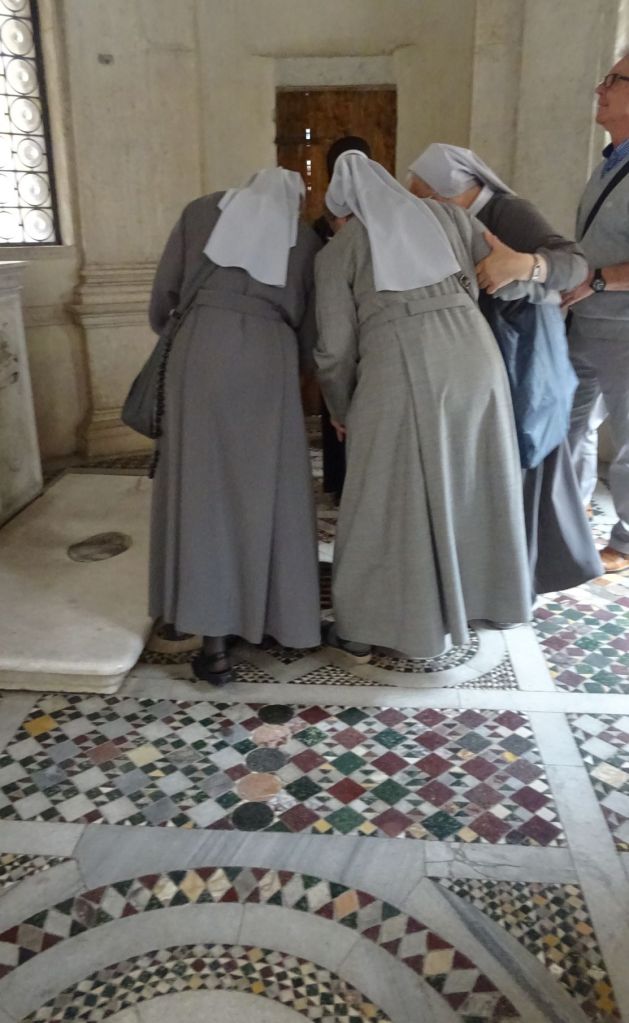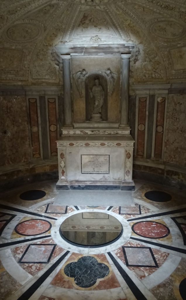Im Inneren treffen wir auf einen schlichten Raum mit dem Petrusaltar und den vier Evangelisten in den Nischen. Der Boden im Cosmatenstil erinnert noch an das Mittelalter. In der Mitte des Raums sehen wir durch eine runde Öffnung hinunter in die Krypta mit einem weiteren Loch, unter dem der Standpunkt des Kreuzes von Petrus gestanden haben soll. Dadurch bildet sich quasi eine imaginäre Achse, die den Tempietto zusammenhält.