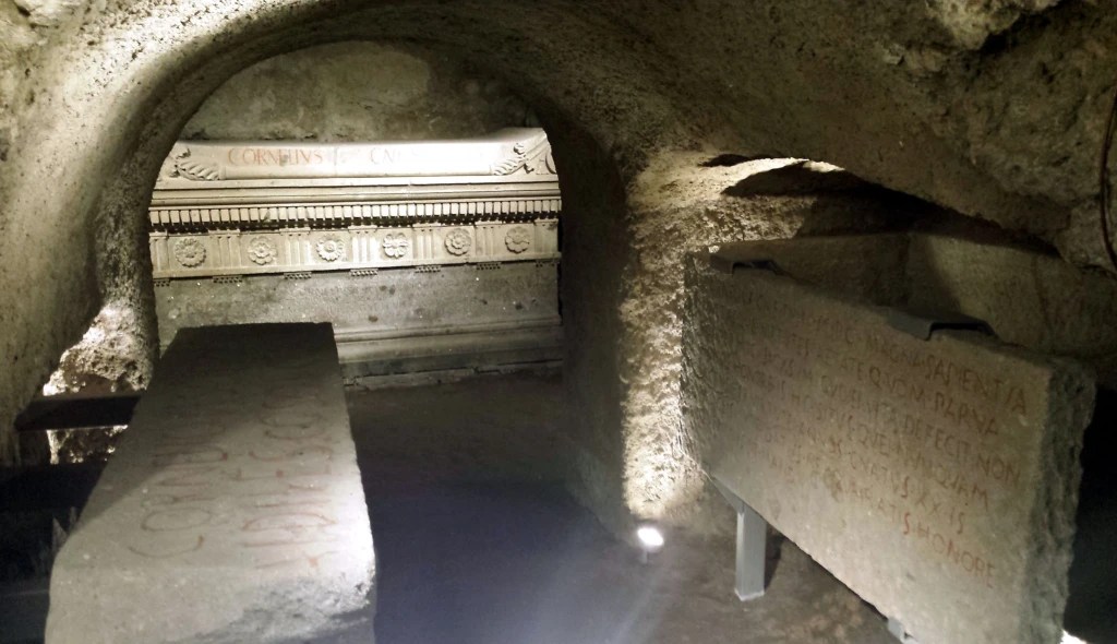 Die Scipionen waren eine der einflussreichsten Familien der römischen Republik, d.h. der letzten drei Jahrhunderte vor Christi Geburt. Der Gründer des Zweigs der großen Familie der Cornelier war Lucius Cornelius Scipio Barbatus, der auch die Grablege begründete, Er bekleidete verschieden politische Ämter und erweiterte das römische Reich nach Süditalien. Er starb zwischen 280 und 270 v.Chr. Sein Sarkophag ist der Einzige, der fast vollständig erhalten ist. Das Original steht heute oberhalb der Simonetti-Treppe am Beginn des Rundgangs durch die Vatikanischen Museen. Die Inschriften auf diesem Sarkophag und dem seines Sohns, die Scipionenelogien, gelten als älteste lateinische Gedichte. Über der Kopie im Grab ist noch das in die Felsendecke gestemmte Loch sichtbar durch das man den Sarkophag heraus hievte.