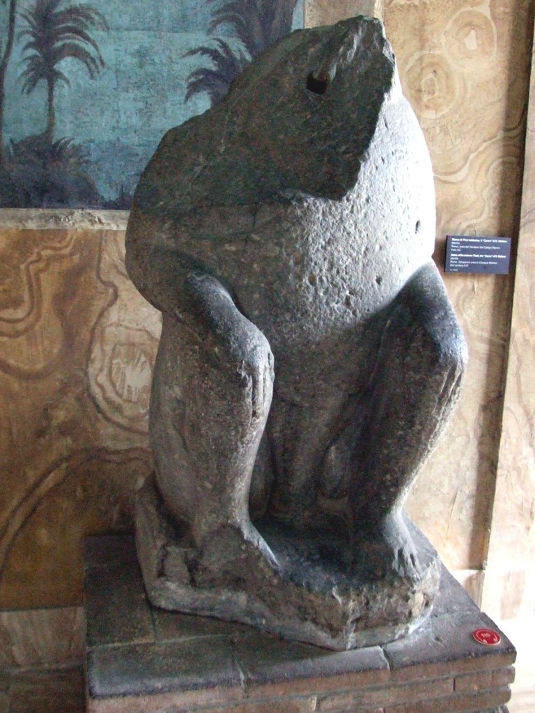 Es ist eine bemerkenswerte Geschichte, wie die Kirche zu ihrem Namen kam. Ursprünglich heißt sie Santo Stefano de Pinea nach dem Stadtteil Pigna, der seinen Namen wiederum vom antiken bronzenen Pinienzapfen hat, der hier gefunden wurde und heute im Vatikanischen Museum zu sehen ist. Irgendwann wurde am Eingang der Kirche eine eigenartige Skulptur aufgestellt. Sie stellt einen Pavian, das heilige Tier des ägyptischen Gottes Thoth, dar. Die Statue wurde, wie ihre Inschrift erzählt 159 n.Chr. im Tempel des Osiris aufgestellt. Die mittelalterlichen Römer tauften ihn jedoch wegen seines dümmlichen Gesichtsausdrucks „Macacco“, also dummer Affe, oder im Dialekt kurz „Cacco“. Der Ausdruck ging schließlich auf die Kirche über und haftete auch hartnäckig an ihr, obwohl der Pavian, inzwischen kopflos, längst in die Vatikanischen Museen umgezogen ist. Dort steht er heute in der ägyptischen Abteilung.