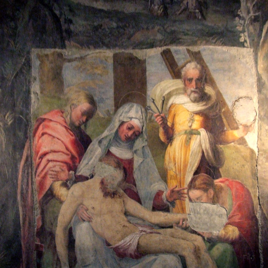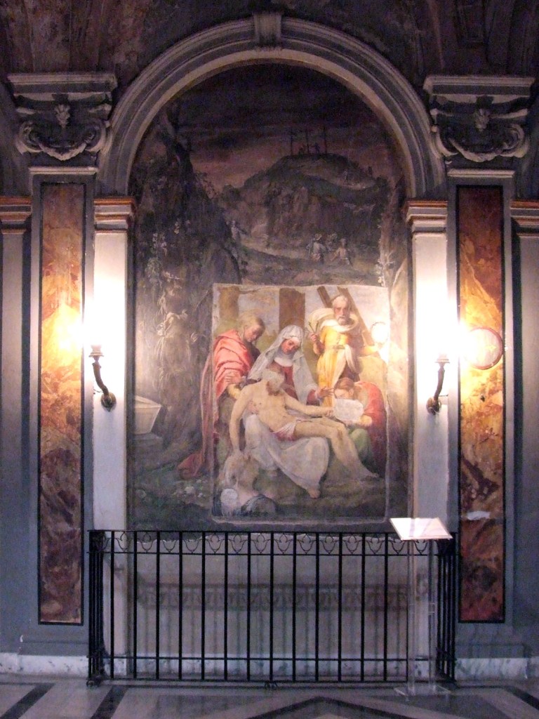 Aus der Zeit vor dem Umbau stammt noch das wertvollste Kunstwerk, ein Fresko von Perin del Vaga von 1519, das eine Pietà, Maria mit dem toten Christus auf dem Schoß, darstellt. Ihr zur Seite stehen Maria Magdalena und der Apostel Johannes. Hinter der Gruppe steht Josef von Arimathäa, der das für ihn selbst bestimmte Felsengrab für die Bestattung Jesu zur Verfügung stellte. Er ist der Einzige, der den Betrachter anschaut und somit in das Geschehen einbindet. Er präsentiert die Dornenkrone und die drei Nägel, mit denen Jesus ans Kreuz geschlagen wurde.