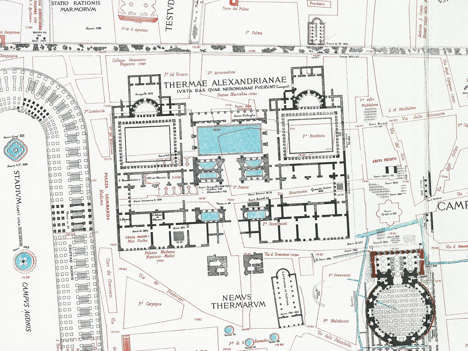 Der Palazzo Madama steht im Südwesteck des Gebiets, das einst von den Thermen des Nero eingenommen wurde. 62 n.Chr. erbaut und unter Kaiser Severus Alexander 227 n.Chr. umgebaut und vielleicht auch vergrößert, waren dies die ersten großen Thermen mit symmetrischem Grundriss. Im Mittelalter müssen von ihnen noch beachtliche Ruinen gestanden haben, die der Abtei Farfa in der Sabina gehörten. Die Thermen werden in verschiedenen Beschreibungen erwähnt. In dieser Ruinenlandschaft wurden Gärten angelegt und Behausungen eingebaut. 998 werden der Abtei Farfa der Besitz mehrerer Kirchen und Hospize in diesem Gebiet bestätigt, Santa Maria, San Benedetto und San Salvatore, die alle den Namenszusatz „in thermis“ trugen und vermutlich in Räume der Thermen eingebaut waren. Leider besteht heute keine der Kirchen mehr. Von den Thermen sind nur noch vier Säulen übriggeblieben. Zwei stehen heute in der Via di Sant’Eustachio, die anderen zwei wurden von Borromini ins Pantheon eingebaut, als Ersatz für die verschwundenen Säulen in der Nordostecke der Vorhalle. 1478 verkaufte die Abtei Farfa ihren Besitz im Gebiet der Thermen an die französische Krone, die hier ihre Nationalkirche San Luigi errichtete. Heute berühmt für die Matthäusbilder von Caravaggio.