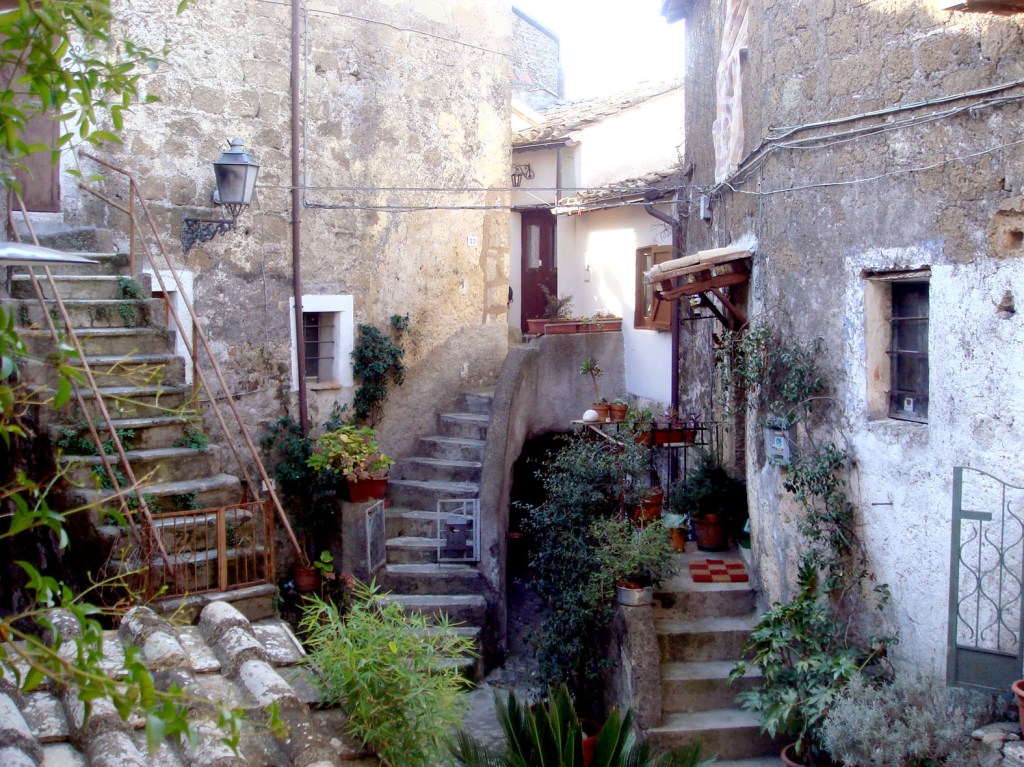 Schließlich biegt man um eine Kurve und sieht das Städtchen Calcata vor sich, dass sich schwindelerregend an einen Felssporn über dem Treja krallt. Ein Ort, der lange vor der Gründung Roms besiedelt war. Von den geheimnisvollen Faliskern, deren Priester auf dem nahen Berg Soracte zu Ehren Apollos in lodernde Feuer sprangen. Als die Römer 241 v. Chr. deren Hauptstadt Falerii dem Erdboden gleichmachten, ging das Faliskerland im beginnenden Römischen Reich auf.