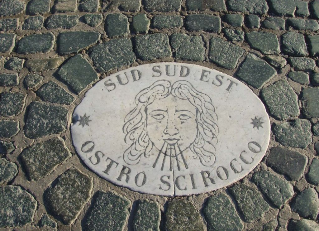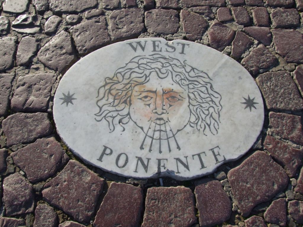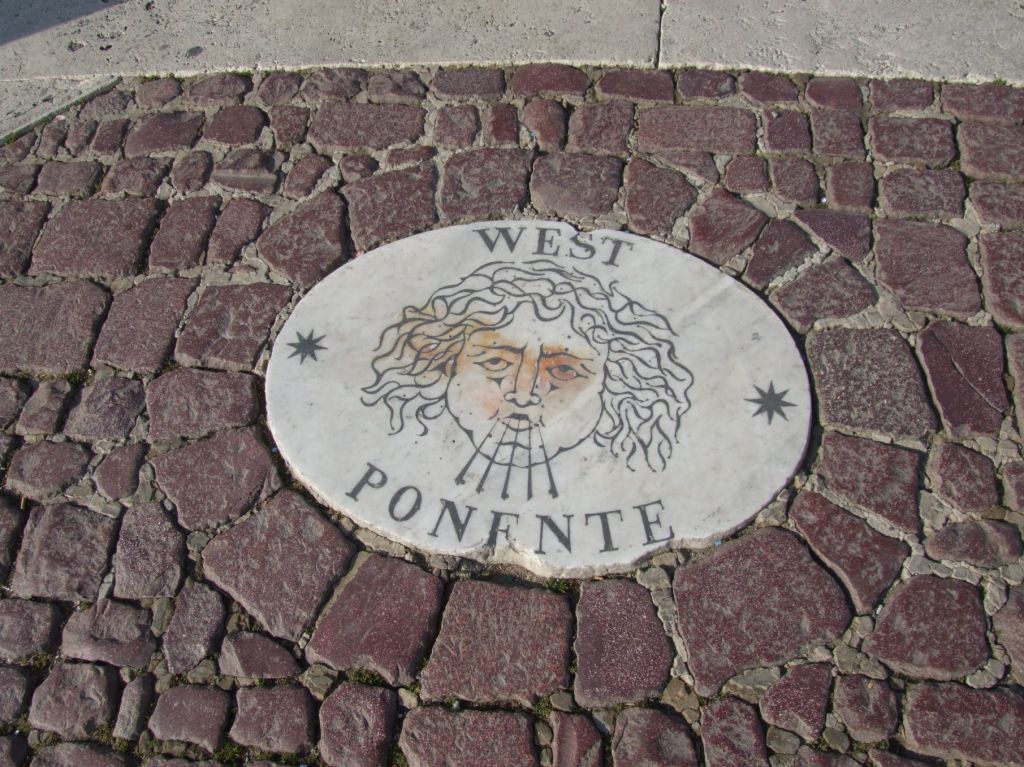 Doch wer das Buch (oder den Film) Illuminati kennt, weiß, dass es auch in Rom eine Geschichte der Winde gibt. Vielmehr, er ahnt es vielleicht höchstens. Da Dan Brown ziemlich schlecht bis gar nicht für seinen Thriller recherchiert hat, gibt die Marmortafel mit der Aufschrift „West Ponente“ ganz zusammenhangslos den Schauplatz für den Mord an einem Kardinal her. Da hat Dan Brown eine Geschichte wie im „Englischen Patienten“ verschenkt. Der Leser erfährt nichts über die Bedeutung des Ponente. Dabei ist die Tafel nur eine von insgesamt 16 Steinen einer großen Windrose, die rund um den majestätischen Obelisken auf dem Petersplatz angeordnet sind. Falls ihr mal dort seid, schaut sie euch an und ihr wisst, aus welcher Richtung der Wind weht.