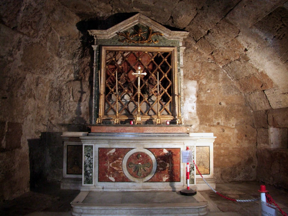 Darunter befindet sich ein trapezförmiger Raum mit Mauern aus Tuffblöcken, der aus dem 2. Jhd. v.Chr. stammt. Von hier erreichte man die nicht erhaltenen weiteren Räume des Gefängnisses, die in den Abhang des Kapitols gegraben waren. Die sogenannten Lautumiae, wörtlich Steingruben. Einen Stock tiefer befindet sich das eigentliche Tullianum, das ursprünglich nur durch ein Loch in der Decke erreichbar war. Ein rundes Gewölbe, dessen Steinblöcke ohne Mörtel übereinander gefügt sind, und das daher viel älter sein muss. Mit Beklemmung kann man sich vorstellen, dass dies ein Ort ohne Wiederkehr war. Die Gefangenen wurden hier erdrosselt und durch ein weiteres Loch im Boden direkt in den antiken Abwasserkanal, die Cloaca Maxima entsorgt. Wir wissen von einigen prominenten Gefangenen, so Jugurtha, numidischer König, der 104 v.Chr. hier starb und Vercingetorix, Anführer der Gallier im Krieg gegen Julius Cäsar.