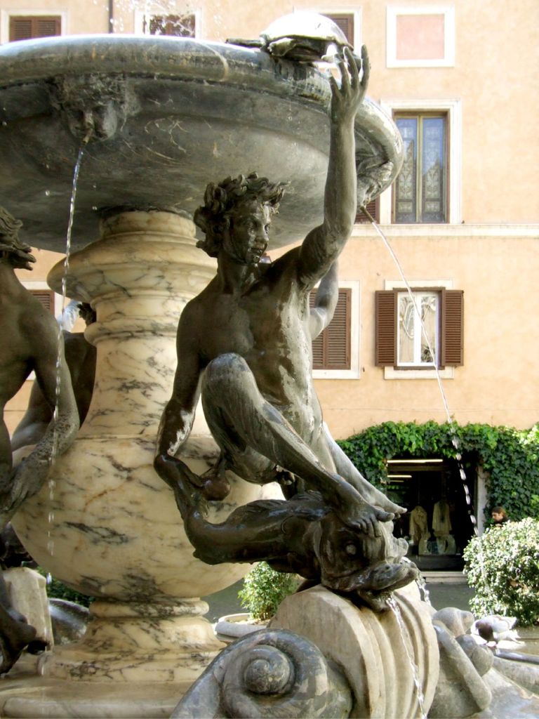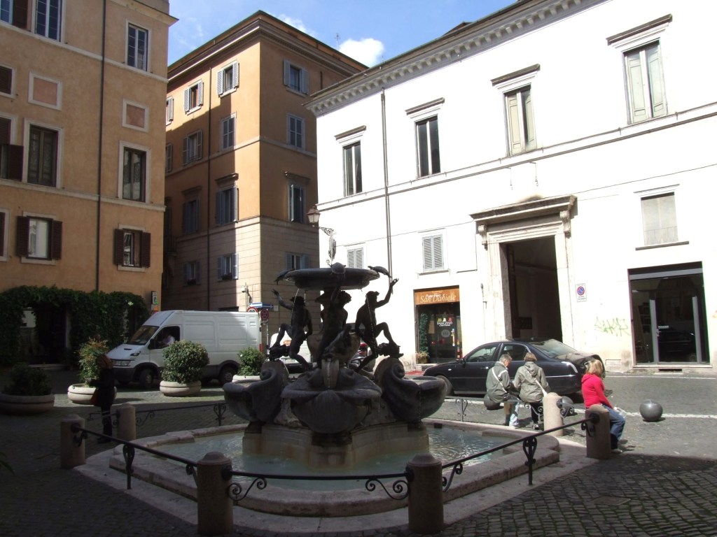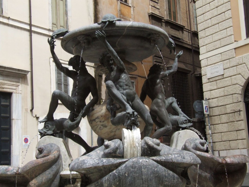 Wenn man an einem schönen lauen Abend durch die römische Altstadt wandert, kann es passieren, dass man plötzlich auf einen kleinen Platz mit einem ganz außergewöhnlichen Brunnen trifft. Es ist die Fontana delle Tartarughe, der Schildkrötenbrunnen, der eine eigenartige Faszination ausübt. Der römischen Stadtverwaltung ist es gelungen die Piazza Mattei weitgehend von Autos zu befreien. Auch Läden oder Kneipen gibt es kaum. Nur die Bar Tartuga stellt abends ein paar Stühle vor die Tür. Und so kann man mit einem guten Rotwein in der Hand sich ganz auf das Rauschen des Brunnens einlassen.