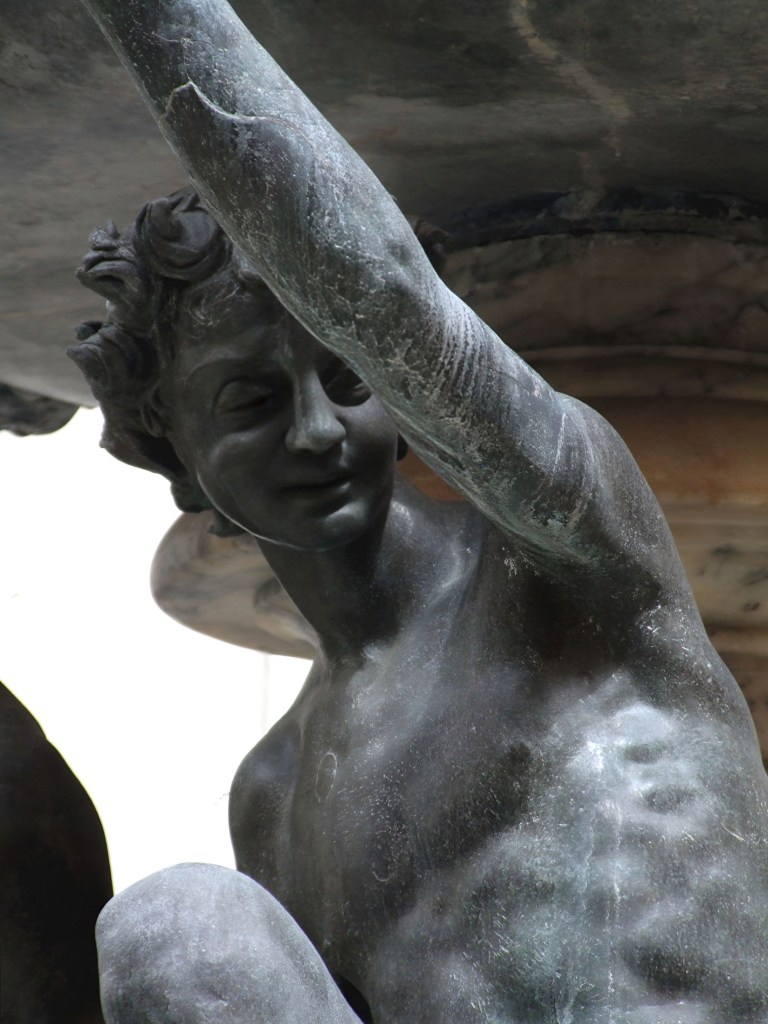 Die dunklen Bronzeskulpturen von vier Jünglingen spiegeln das matte Licht der Straßenlaternen. Die jungen Männer stellen jeweils einen Fuß grazil auf einen Delphin und strecken sich unnatürlich affektiert zur oberen Brunnenschale um je eine Schildkröte zum Trinken über den Brunnenrand zu schieben. Ich denke es ist diese Mischung aus Akustik, dem Rauschen, der Reflexion des Lichts und der eigenartigen Thematik, der ungewöhnlichen Symbiose der pubertierenden Knaben und der plumpen Reptilien, die den Besucher des Platzes in seinen Bann zieht.