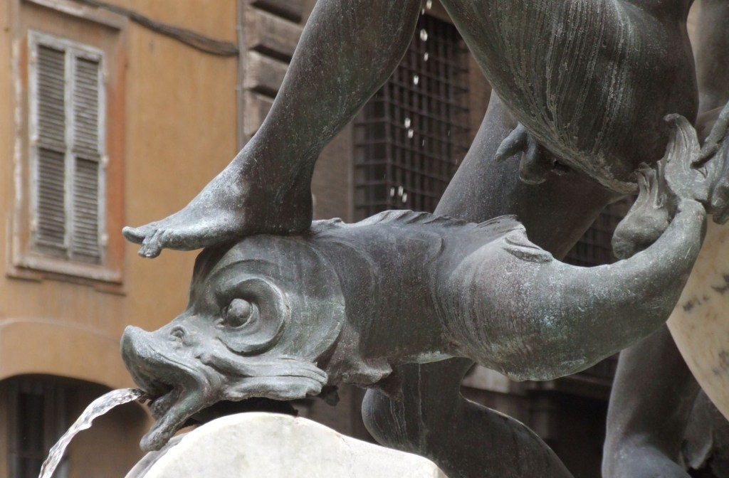 Die schon gegossenen Tiere verwendete er für seine Fontana della Terrina, dem eigenartigen suppentopfförmigen Brunnen, der vom Campo de’Fiori vor die Chiesa Nuova versetzt wurde. Leider verschwanden dabei die Delfine spurlos.