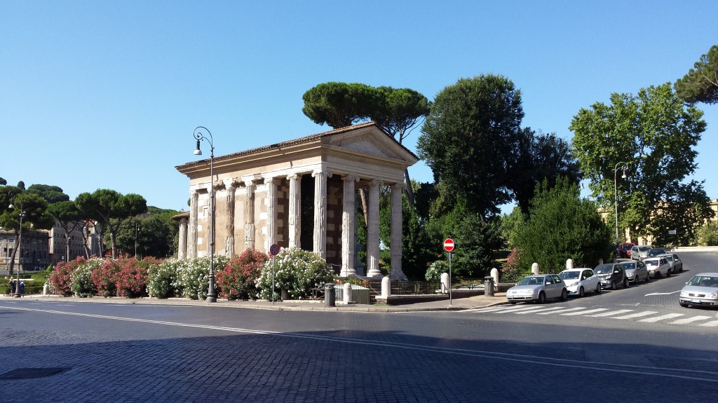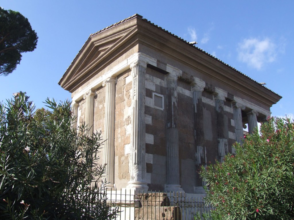 Wir wissen heute, dass der Tempel dem Portunus geweiht war, dem Gott der Türen, weswegen er immer mit Schlüsseln dargestellt wurde. Portunus war aber auch der Hafengott, wachte also über das Tor der Stadt und die Waren die darüber nach Rom kamen und hatte daher seinen Platz hier am alten Tiberhafen. Der Tempel bestand an dieser Stelle seit dem 4. Jahrhundert v.Chr. Doch sein heutiges Aussehen verdankt er einem Neubau im 2. Jahrhundert v.Chr. Einem vom Stil schon ganz römischen Tempels. Die freistehenden ionischen Säulen aus Travertin beschränken sich auf den vorderen Teil, ansonsten sind nur Halbsäulen auf die Außenmauer aufgesetzt. Mauern und Halbsäulen wurden aus Tuff gearbeitet. Alles wurde darauf mit Stuck überzogen.