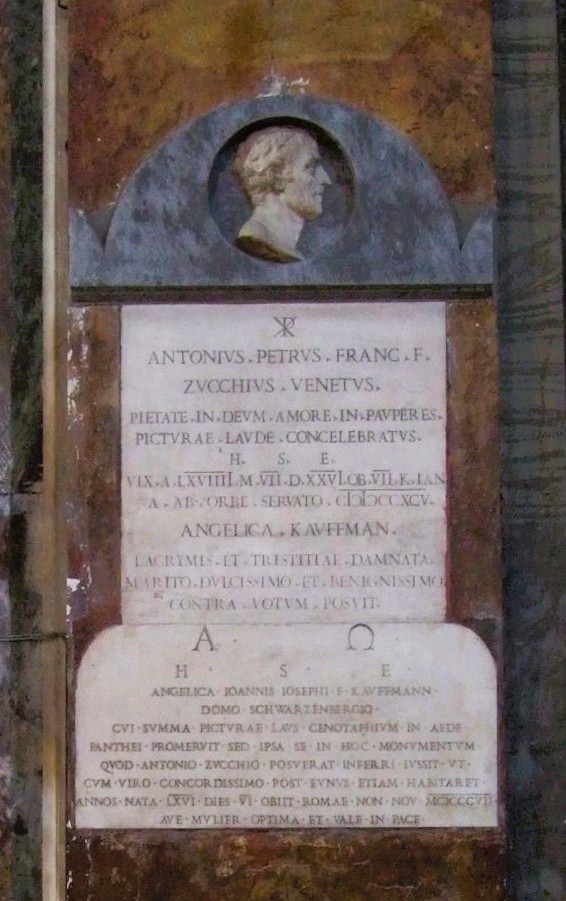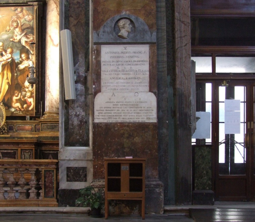 An einem Pfeiler am linken Seitenausgang erinnern zwei Tafeln an ein prominentes Ehepaar. Das obere Epitaph mit Porträt ist dem Maler Antonio Zucchi gewidmet. Doch eigentlich war er nur der Manager seiner viel bedeutenderen Frau Angelika Kauffmann, deren schlichte Grabplatte darunter angebracht ist. Der lateinische Text besagt, dass sie würdig gewesen wäre im Pantheon bestattet zu werden, Doch entschied sie sich, an der Seite ihres Ehemanns zu ruhen. Angelika Kauffmann wurde als Tochter des Malers Joseph Johann Kauffmann 1741 in Chur geboren, wo dieser gerade einen Auftrag am bischöflichen Schloss ausführte. Doch ihr Heimatort ist eigentlich Schwarzenberg im Bregenzerwald, dem Dorf, dem sie immer verbunden blieb. Dort schuf sie auch ihr erstes öffentliches Kunstwerk. Im zarten Alter von 15 Jahren malte sie die Fresken der 12 Apostel an die Seitenwand der Dorfkirche, während ihr Vater das Deckenfresko schuf. 1802, auf dem Weg von London nach Rom machte sie hier nochmals Station und malte das Altarbild. Es blieben ihre einzigen Werke, die sie auf österreichischem Boden schuf. Dennoch wurde ihr Bildnis auf dem zwischen 1966 und 1983 ausgegebenen Hundert-Schilling-Schein verewigt.