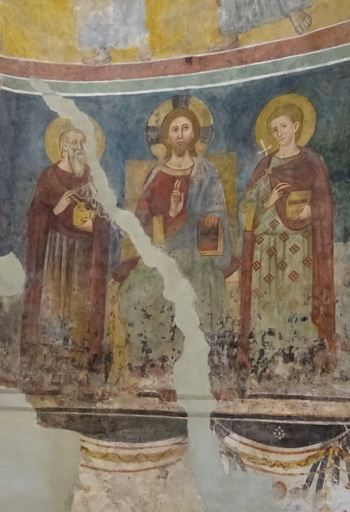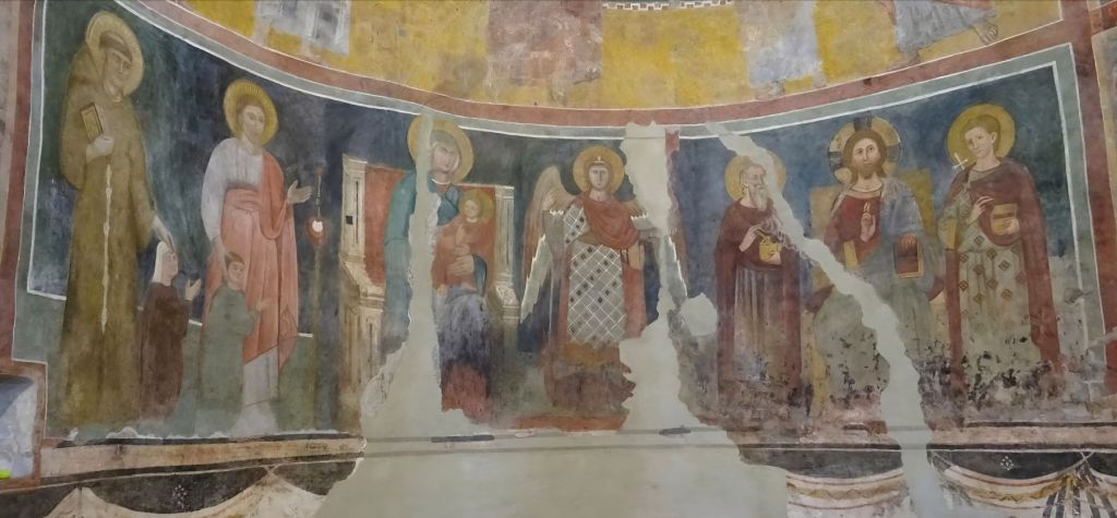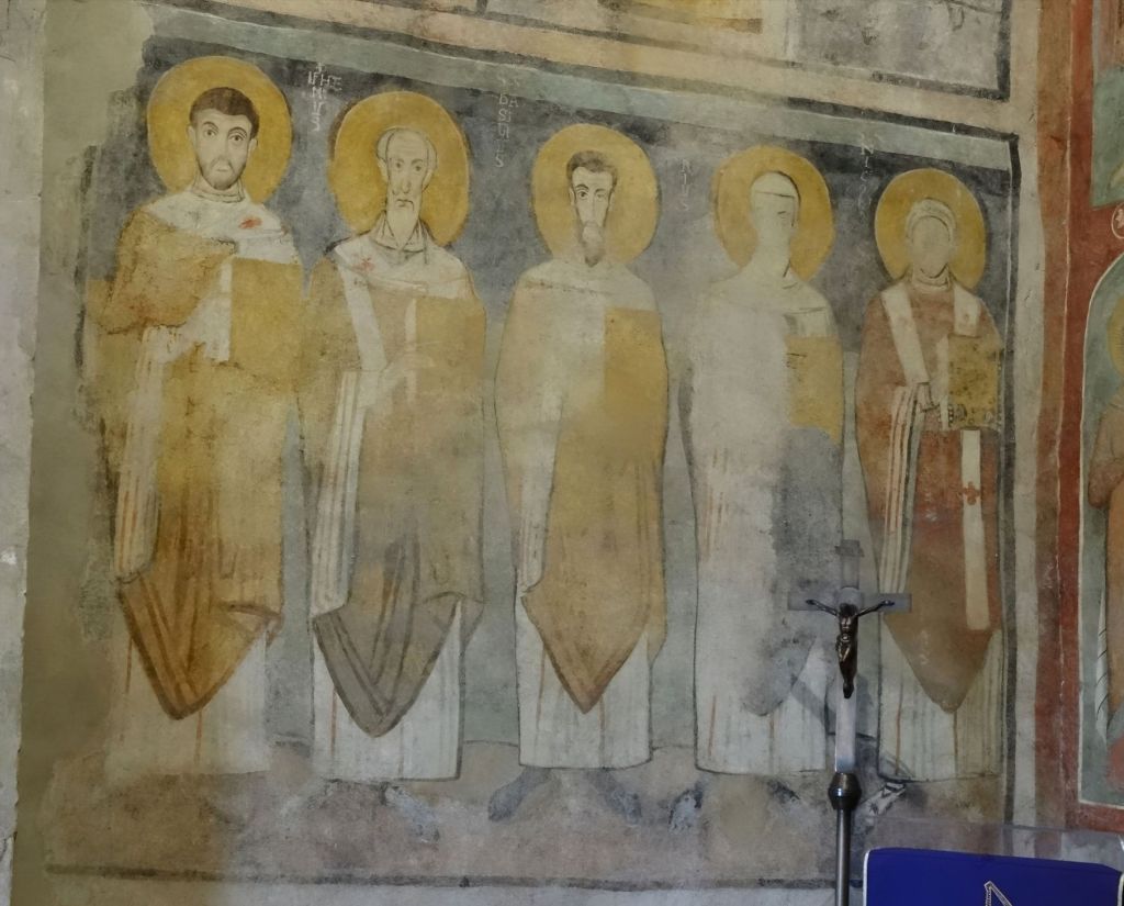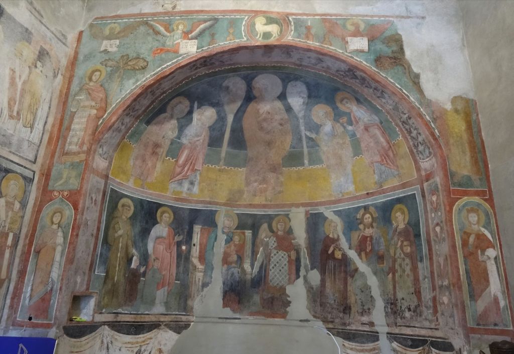 Leider ist der obere Teil des Apsisfreskos nicht gut erhalten. Im unteren Teil sieht man in einer Abfolge die Madonna mit Kind auf einem Thron und Christus auf einem Thron. Jeweils eingerahmt von Heiligen und dazwischen links, die kleineren Stifter der Ausstattung. Die zwei Szenen werden von einem Erzengel getrennt. Die Heiligen, die Christus einrahmen sind wohl Cyrius (der ältere) und Johannes. Auf der linken Wand sieht man weitere Heilige. Auch hier vermutlich links die zwei Ägypter Johannes und Cyrius.