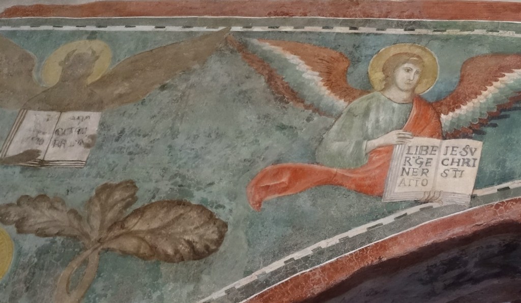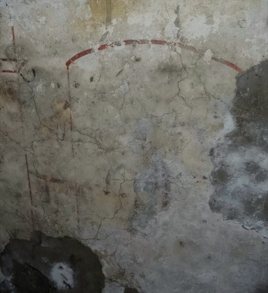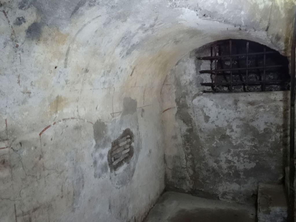 Über eine steile, moderne Treppe können wir nun noch in das antike Grabmal hinabsteigen. Es kann auf das späte 2. oder 3. Jahrhundert n.Chr. datiert werden. Hier wurden auch tatsächlich die Reliquien der Heiligen aufbewahrt. An den Wänden sieht man, oder besser ahnt man noch die Reste der antiken Dekoration. Einfache stilisierte Architekturelemente aus roter Farbe. Auf der Nordwand sieht das geübte Auge eine Darstellung der römischen Göttin Justitia. Zumindest die Waage kann man noch gut erkennen.