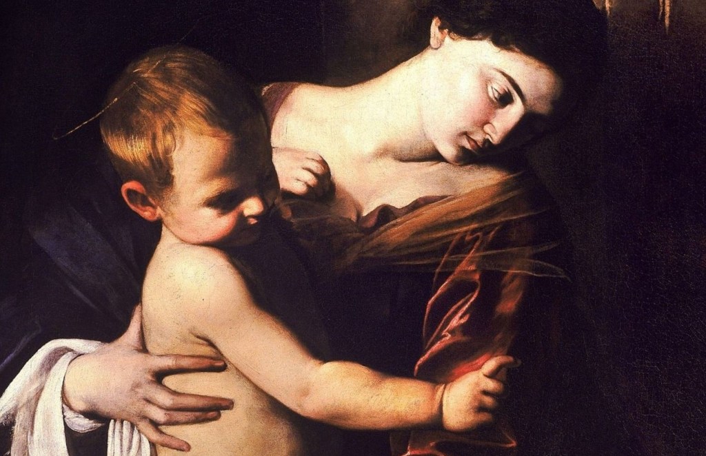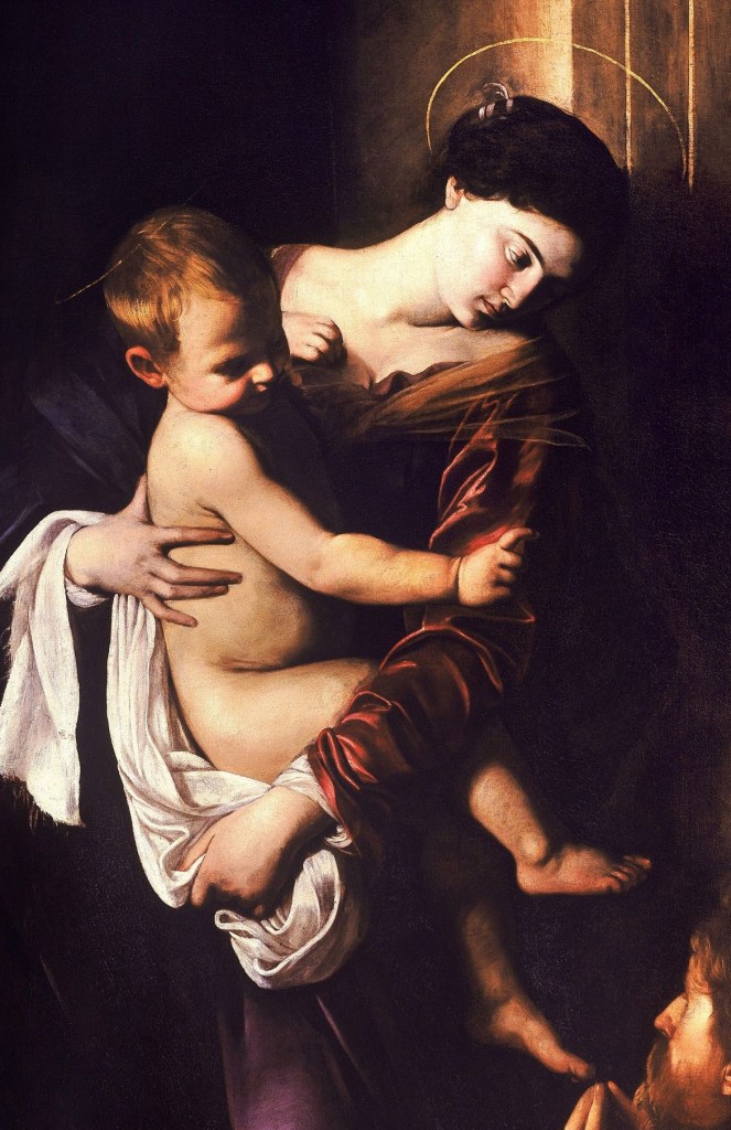 Anders als Thusnelda neigt die Madonna ihren Kopf nach links und entblößt einen langgestreckten Hals. Ein Motiv, dass Caravaggio auch bei anderen Madonnendarstellungen einsetzte und das Verletzlichkeit symbolisieren soll. Maria trägt ein deutlich dem Säuglingsalter entwachsenes Christuskind auf dem Arm, das die Pilger segnet.