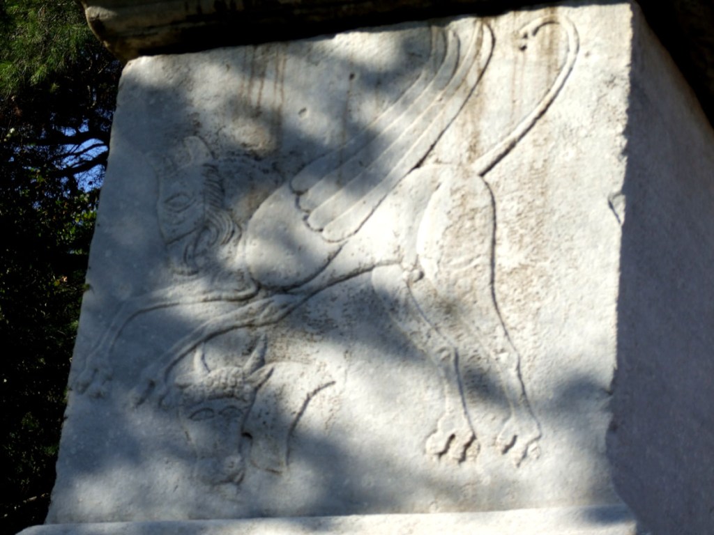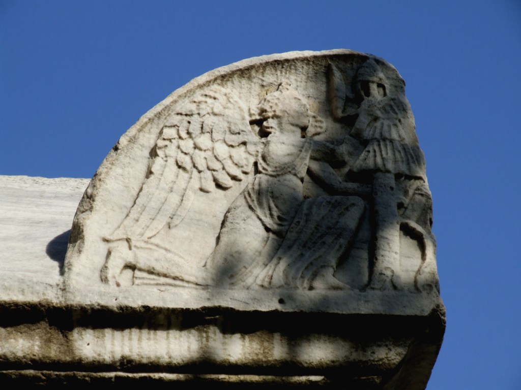 Alles, was wir über Vibius Marianus wissen, wissen wir von dieser Inschrift. Er hatte seine Karriere im Militär gemacht, wie man auch aus dem Figurenschmuck erraten kann. Die Dioskuren Castor und Pollux an den Seiten sind flankiert von Adlern, wie wir sie von den Standarten der Legionen kennen. An der Frontseite sind Siegesgöttinnen mit Fackeln dargestellt, die an Engel erinnern.