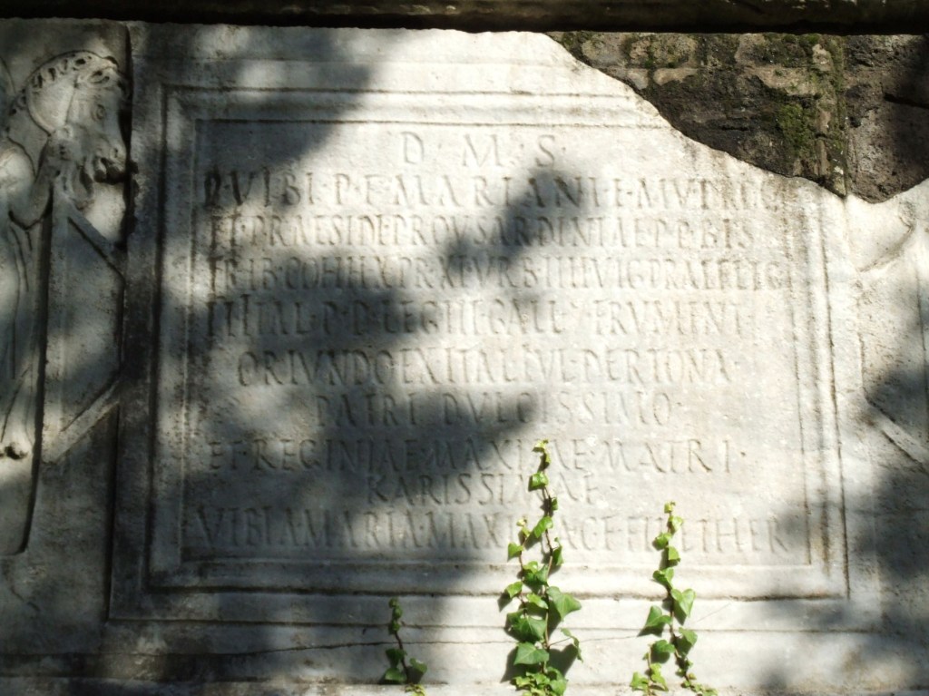 Doch die falsche Zuweisung des Grabmals lag wohl auch daran, dass die meisten Leute im Mittelalter Analphabeten waren, denn man muss kein Historiker sein um den Namen der wahren Besitzer des Grabes, das zwischen 220 und 240 errichtet wurde, auf der Inschrift zu identifizieren. Publius Vibius Marianus und seine Ehefrau Reginia Maxima fanden hier ihre letzte Ruhe. Allerdings muss man sich zum Lesen auf die Rückseite bemühen, denn die Via Cassia führte, wie man auch an Resten des Basaltpflasters sieht, ursprünglich an der anderen Seite des Sarkophags vorbei.